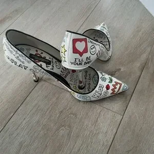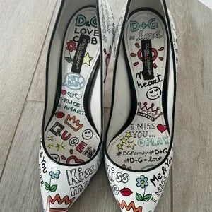 Playful doodle-print pumps by Dolce & Gabbana. Pointed-toe silhouette with colorful hand-drawn motifs. Classic white leather base with vibrant accents. Chic and fun statement shoe. Runs about a size small.