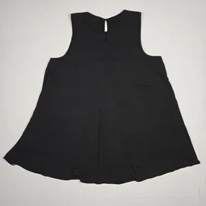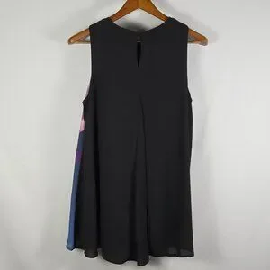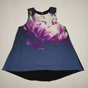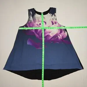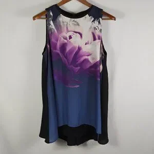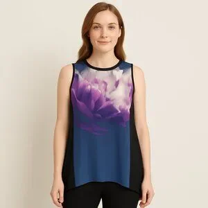 Sleeveless Alfani tunic featuring a large purple floral print on a navy front. Black side panels and back provide contrast. Lightweight, flowy silhouette for easy wear.