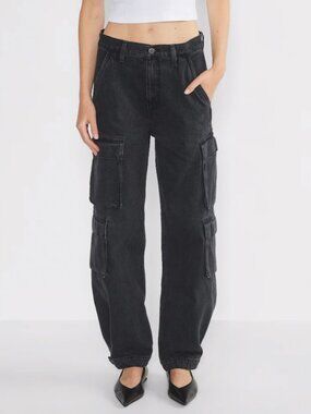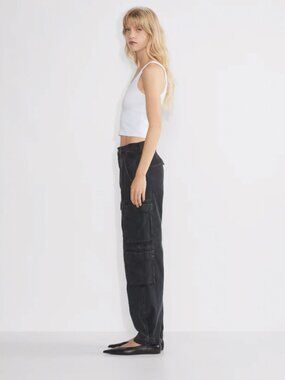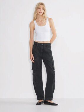 These premium cotton cargo jeans feature a high-rise waist, wide-leg silhouette, and relaxed fit inspired by ’90s style. In the washed black shade “Black Eyeliner,” they’re made from 100% cotton denim that softens over time and adds a utilitarian edge to any look. Side cargo pockets and a drapey structure make them both stylish and functional. In new, unworn condition without tags.