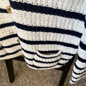 Elegant navy and white stripes. Textured knit with gold button closure and front pockets. Perfect for layering.