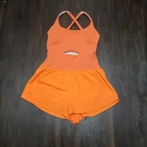 Bold orange romper with sleeveless style. Features a stylish cut-out at the waist. Ideal for active lifestyles.