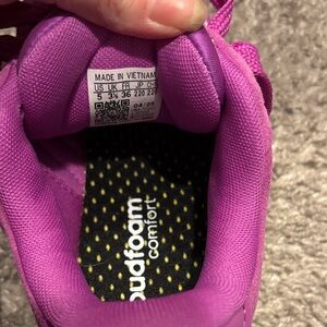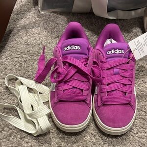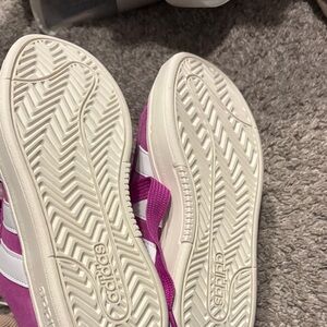 Bright fuchsia suede upper. Signature white three-stripe accents. Padded collar and cushioned sole. Lace-up closure for a snug fit.