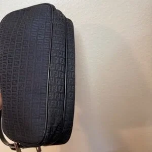Fendi Zucca Zucchino canvas baguette bag in a sleek black-on-black colorway, iconic FF monogram pattern throughout the durable canvas body, leather trim, leather shoulder strap. Made in Italy.