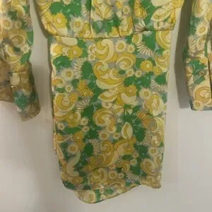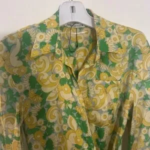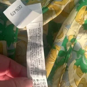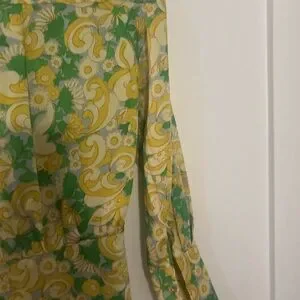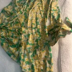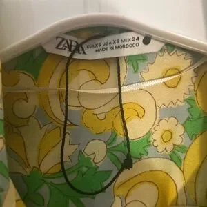 Zara wrap dress with vivid floral motifs. Wrap-style silhouette with tie detail. Lightweight flowing fabric. Long sleeves and V-neckline.Button sleeve with gold button. Yellow and green on a blue background. Measurements in the photos.