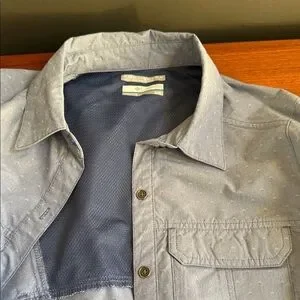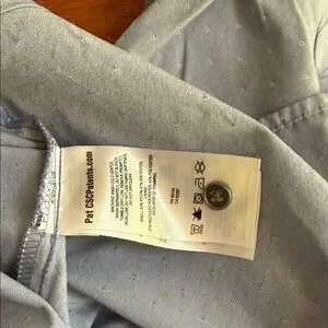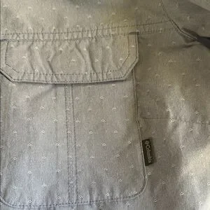 Light blue button-up shirt. Features chest pockets. Long sleeves with button tabs.