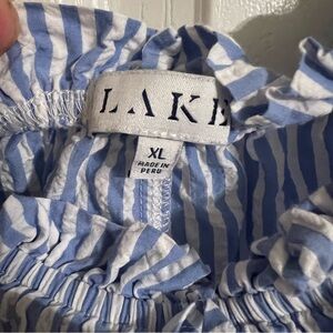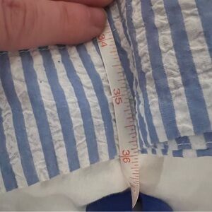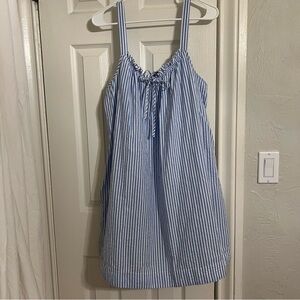 The Alice Nightgown in Blue Seersucker, a subtle, textured blue and white stripe, features a tank that’s elasticated at the front and back for comfort and fit. With a faux tie, ruffle, and pockets, this boxy silhouette is a breezy pick. Made from 100% Pima cotton.