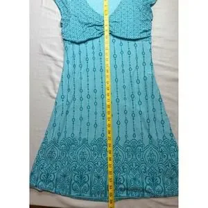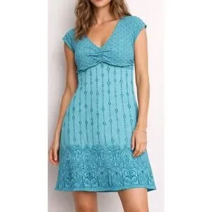Lightweight aqua blue knit dress features V-neck, ruched bust, and intricate geometric bohemian patterns.