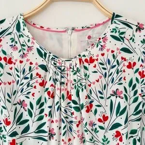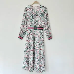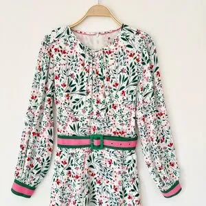Boden Victoria Midi Dress in White, Pink and Green Floral Garden Party, Contrasting Belt, Size 10