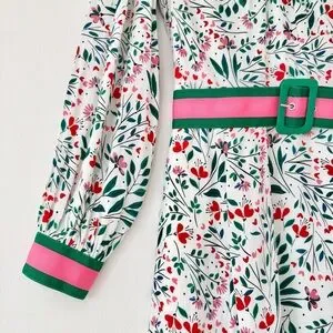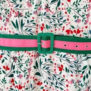 Contrast Detailing: Green and pink grosgrain trim on the cuffs and a matching striped belt with a large green buckle. The belt is reversible with the floral pattern on the underside