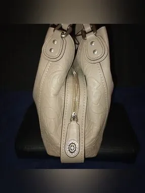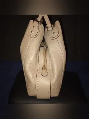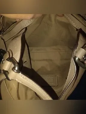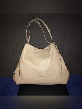 Coach Edie Shoulder Bag 31 With Tea Rose Tooling is pre-owned in excellent condition It was in storage so there is a light scratch on the bottom of the bag. The inside of the bag is pristine