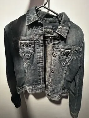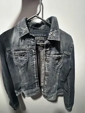 Classic Guess denim jacket with button front. Chest flap pockets and stitched detailing. Lightly faded finish for a worn-in look. Casual cropped silhouette ideal for layering.