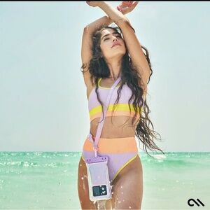 Iridescent waterproof phone pouch from case-mate. Floats for secure water use. Clear window allows camera and touchscreen use. Comes with adjustable strap for hands-free carrying. Great for pool, beach, and boating.
