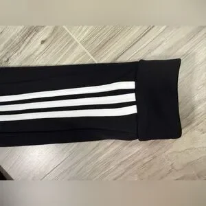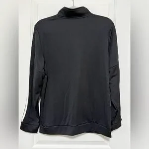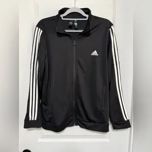 adidas zip-up athletic jacket. Black base with white three-stripe accents on sleeves. Small embroidered adidas logo on chest. Lightweight sporty style for everyday wear. NWOT. Check out the matching pants in another listing!