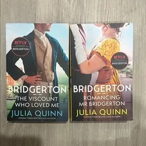 Two Bridgerton novels by Julia Quinn. Vibrant blue cover and bright yellow cover. Clean, collectible paperback set. Great for fans of the series.