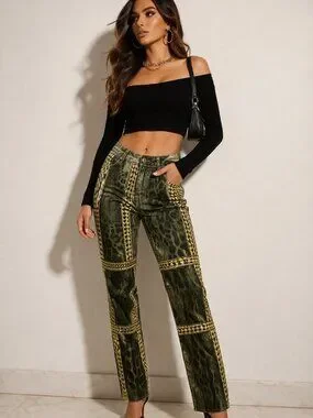 Crafted in a rich green-toned leopard print, the design is elevated with ornate gold chain panel detailing, creating a sculptural, almost couture-like effect through the leg. The intricate placement of print and panels gives these jeans depth, movement, and unmistakable presence.