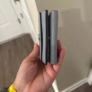 Compact pebbled leather wallet with flap closure. Polished metal 'C' logo accent. Interior organizes cards and bills. Minimal, everyday style.