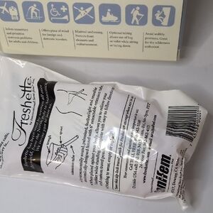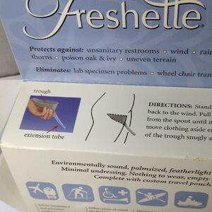 She Wee Freshette Feminine Urinary Director NWT. Freshette feminine urinary director in light blue and white packaging. Clear Freshette logo visible on front. Packaging highlights reusable travel-friendly design. Includes simple usage icons and instructions.