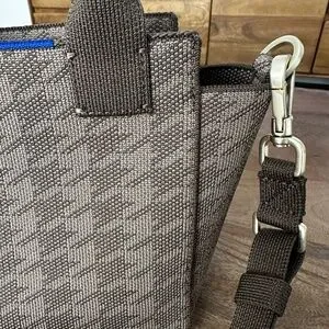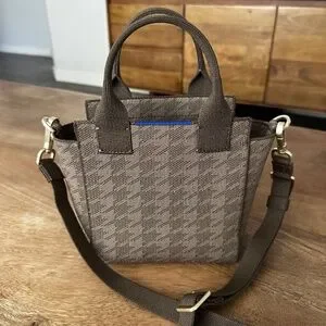 Stylish mini bag by Rothy's. Features a brown textured design. Blue accent adds a pop of color. Includes a detachable strap.