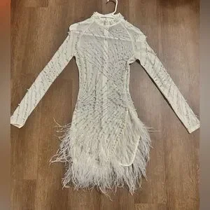 Long Sleeve Ivory Pearl Embellished Mini Dress with Feathered Hem. Only worn once for my birthday a few years back, can no longer fit. 🤍✨ I hope you love it as much as I do!
