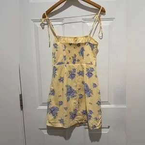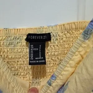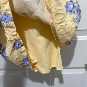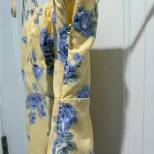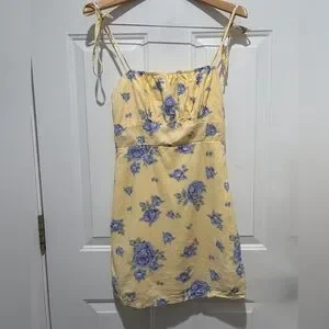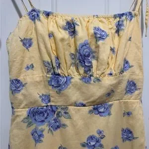 Light yellow floral dress with blue flowers by Forever 21. Smocked top with tie straps and side zipper. Also come with thin yellow under lining. Casual and feminine style.