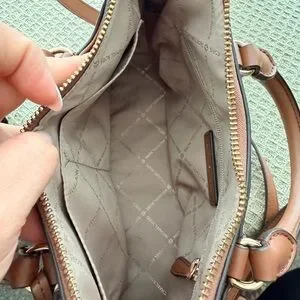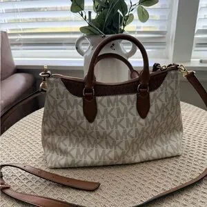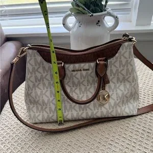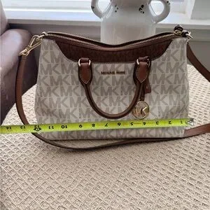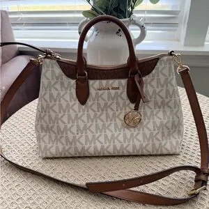 Michael Kors satchel in cream signature canvas with brown leather trim. Gold MK logo charm and hardware accent the bag. Top handles and adjustable strap offer versatile carry. Timeless logo pattern for everyday use.