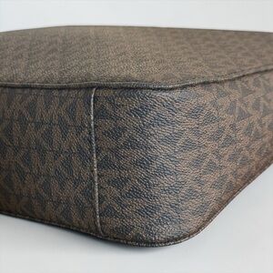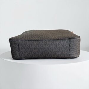 Gorgeous Michael Kors signature logo crossbody bag with a structured silhouette. Features gold toned hardware, an adjustable shoulder / crossbody strap, an exterior slip pocket in the back, and a zip top closure. Measures approximately 10”w x 10”h x 3”d with a 19”-27” adjustable strap.