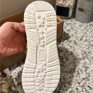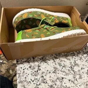Olive green canvas slip-ons with playful pizza graphics. Neon lime bungee laces and bright red insoles add contrast. Casual, fun design for everyday wear.