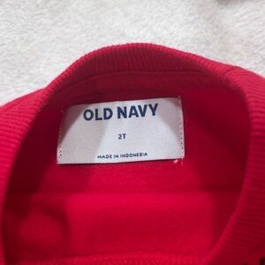 Old Navy red pullover with playful character graphic. Soft crewneck design. Bold printed artwork on front.