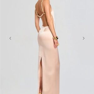 Figure-hugging satin maxi with a clean, slinky silhouette. Pearl-adorned straps add delicate shine. Sculpted side cutout for a contemporary edge. Subtle blush pink hue with soft luster.