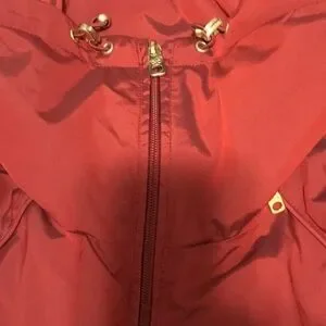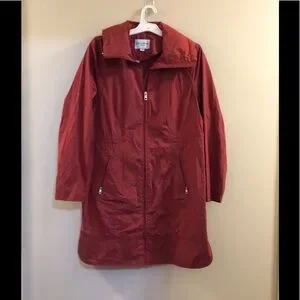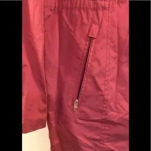 In excellent condition, no holes or stains, Back Bow Hooded Raincoat, An adjustable tie cinches the back of a water resistant jacket designed with a detachable packable hood The lightweight style packs away into an included pouch for added convenience.