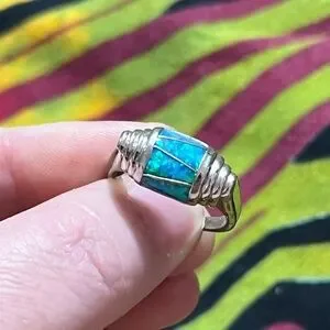 Stunning synthetic blue opal inlay sterling silver artisan made ring. Marked ST 925. Size 8 3/4. Like new condition.