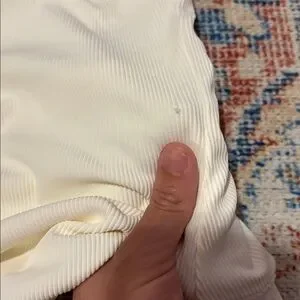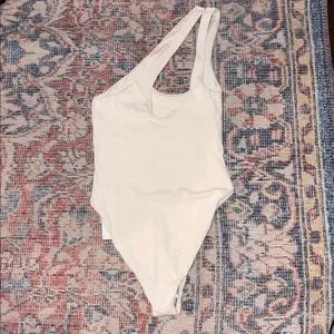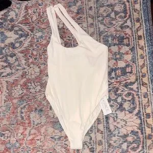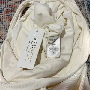 L*Space Phoebe Ribbed One Piece Swimsuit in White size 6. This swimsuit is new with tags, but it does have a little hole on one side on the front (see photo). The hole does not go through both layers of fabric, so no skin shows. Price reflects. Otherwise new with tags and from a smoke-free home.