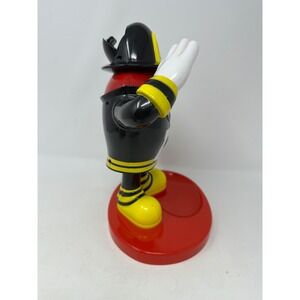 M&M's World collectible candy dispenser features the iconic Red character dressed as a heroic firefighter. This vibrant piece showcases Red in a black and yellow turnout coat and matching fire helmet, complete with a white hose detail and a waving hand gesture. The dispenser is mounted on a sturdy red base with a dedicated tray area for catching dispensed treats. A perfect addition for any M&M's memorabilia collector or as a unique gift for a firefighting professional.