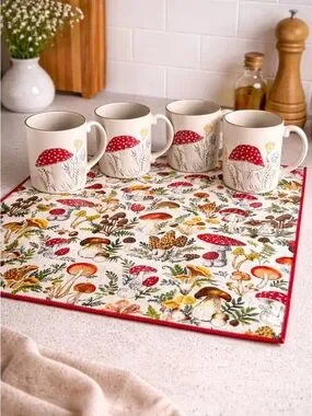 Set of four ceramic mugs and drying mat featuring hand-drawn red mushroom artwork. Cream base with whimsical floral accents for a cozy kitchen look. Comfortable handles and smooth finish make them ideal for daily coffee or tea. The red mushroom detail adds a cheerful pop of color.