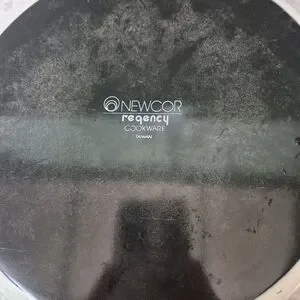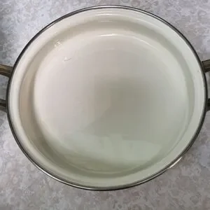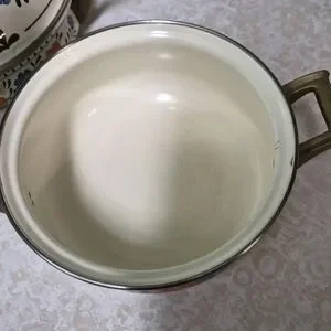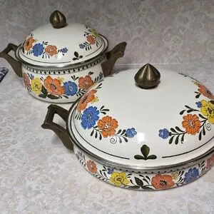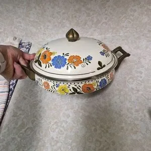 VINTAGE Stylish cream enamel casserole dish featuring hand-painted orange, blue and yellow floral accents. Durable enamel finish for everyday use and attractive serving. Includes matching lid with brass-tone knob and handles for easy transport. Bright floral colors add a cheerful touch to your kitchen and table. BRASS HANDLES some wear but great condition for how old these are