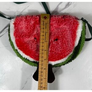 Soft plush crossbody bag captures the playful spirit of the Jellycat Amuseables collection with its vibrant watermelon design. This whimsical accessory features a fuzzy red and green exterior, a smiling embroidered face, and adorable corduroy legs. The bag is secured with a sturdy top zipper and includes a durable green woven strap for comfortable wear. It is in excellent used condition. Perfect for summer outings, festivals, or as a statement piece for a playful daily look.