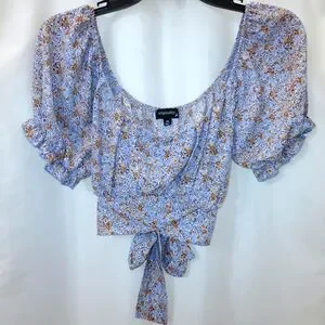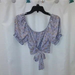 EUC Sz M Floral Tie-Back Puff Sleeve Crop Top Blue On Or Off Shoulder. Boho