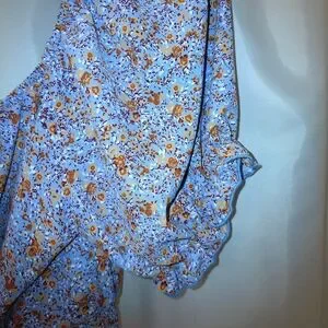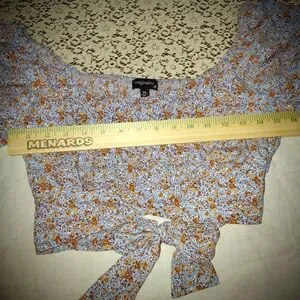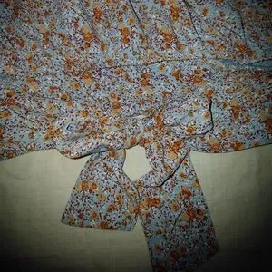 light blue crop top with a delicate orange and white floral print. Features puff sleeves, a scoop neckline, and a flattering tie-back detail. Lightweight and feminine for everyday wear or weekend outings.