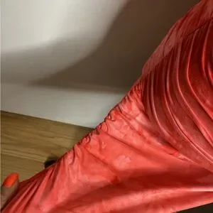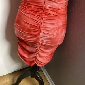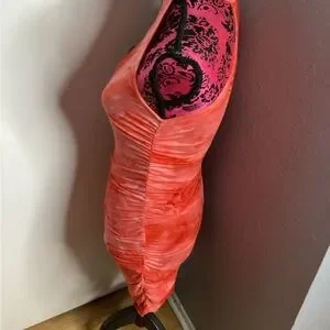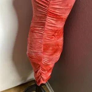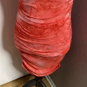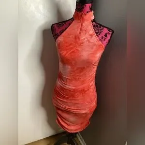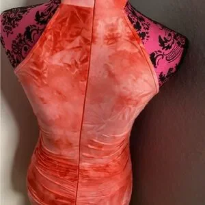 Halter-style mini dress in a vibrant coral tie-dye. Stretch fabric contours the body for a sleek fit. Front zip neckline adds easy wear and modern detail. Ideal for summer nights and weekend outings in coral tones. PTP approximately 15-20 inches great stretch! Length approximately 36 inches. Good condition.