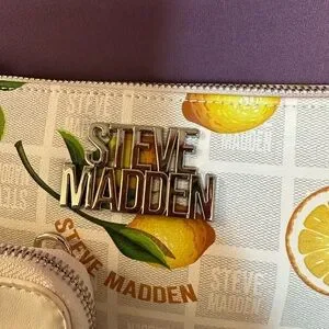 • The Print: A "Lemon Bite" or citrus print featuring sliced and whole lemons with green leaves over a white background subtly patterned with the "Steve Madden" logo in a grid.