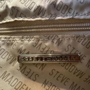 • Hardware: It features silver-tone hardware, including a chunky curb-chain handle and a prominent raised metal "STEVE MADDEN" logo on the front.