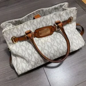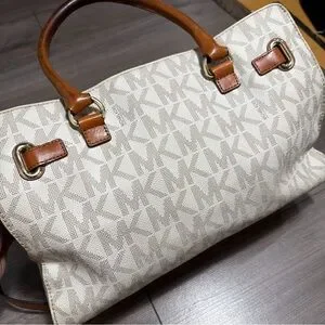MICHAEL KORS Hamilton White Monogram Tote with Brown Leather Trim