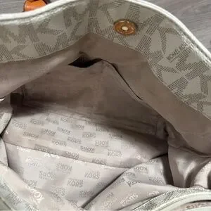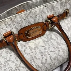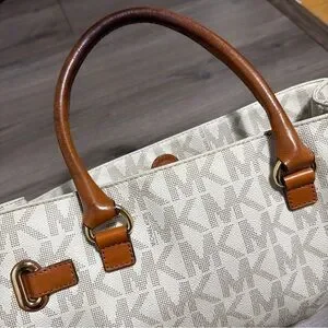 Michael Kors satchel in cream monogram canvas. Brown leather handles and trim with gold-tone hardware. Structured silhouette with top handles and logo plaque. Versatile style for daily wear.