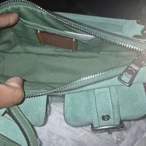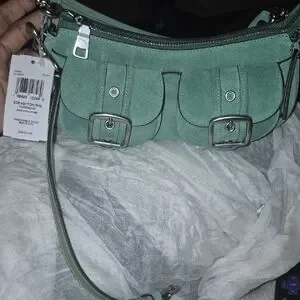 Coach suede shoulder bag in mint green. Two front buckle pockets with silver hardware. Zipper top for secure storage. Padded short shoulder strap for comfortable carry. Sleek, casual style for daily use. Crossbody attachment, suede hang tag, and dustbag. NWT