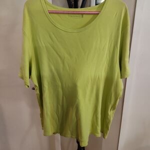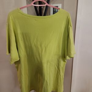 Lightweight lime green short sleeve tee with a relaxed scoop neckline. Soft, breathable fabric for comfortable everyday wear. Easy to style with jeans, shorts, or layered under jackets. Brand: