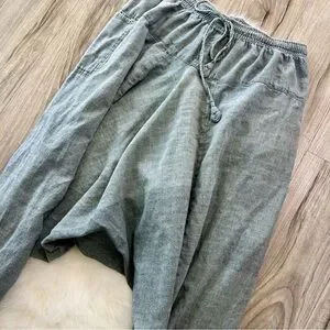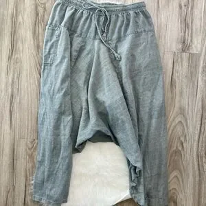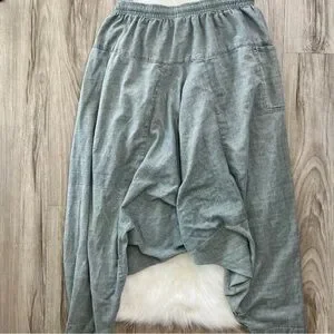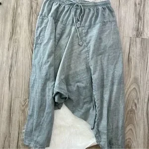 Loose-fit and lightweight cotton harem pants, 100% cotton & made in Nepal. Heathered gray/green color with a drawstring waist and darting. One pocket and patchwork seams give these a high quality and special feel. Free size with an elastic and functional drawstring waist. Excellent condition
