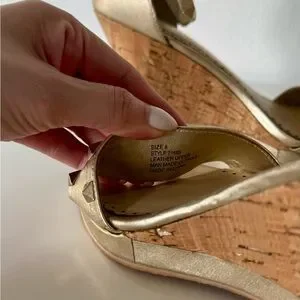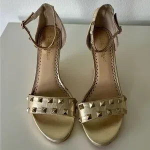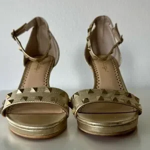 Metallic gold wedges with pyramid stud accents. Ankle strap with buckle for a secure fit. Cork platform adds subtle height. Sleek open-toe silhouette for warm-weather outfits. Great pre loved conditions with a few minor scuffs in the front. Please examine pics carefully. Size 8.
