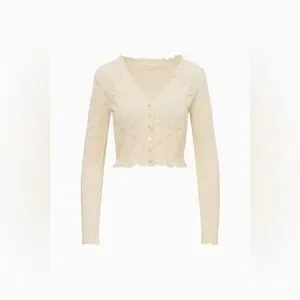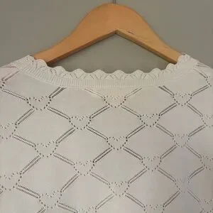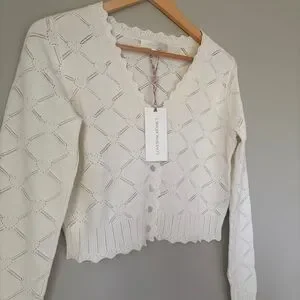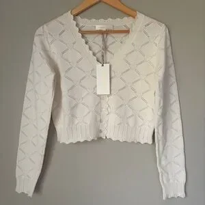 Cozy chic in the Petra Cardigan. Featuring a rib pointelle fabric, this knit is reimagined with our sweetheart argyle pattern with a pointelle detail, a v-neckline, our custom LoveShackFancy faux shell heart-shaped buttons, and pointelle scallop trims at the hem and the cuffs.