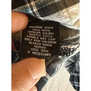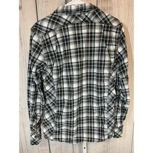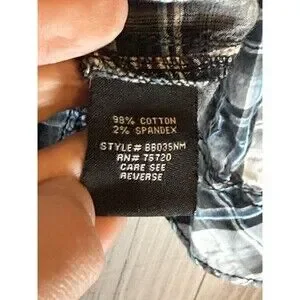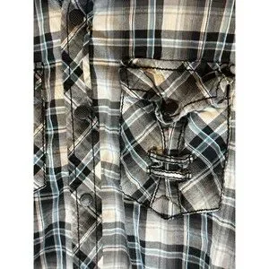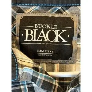 The product is a stylish and slim-fitting Buckle Black men's shirt in size small, featuring a black and white plaid pattern with a collar and snap closures. Made from a blend of spandex and cotton, this woven shirt is machine washable and designed for a spread collar style. With a vintage look and a slimming fit, this shirt is perfect for casual occasions and adds a modern touch to any outfit. Made in China, this shirt is part of the Buckle Black product line, offering quality and style for men looking to make a statement with their clothing.