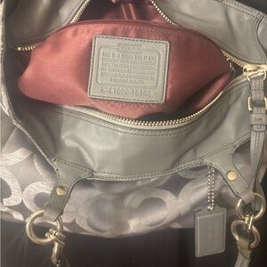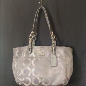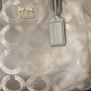 Coach tote with embossed signature C pattern. Dual shoulder straps and metal hardware. Exterior hang tag and logo plaque. Spacious, everyday silhouette.